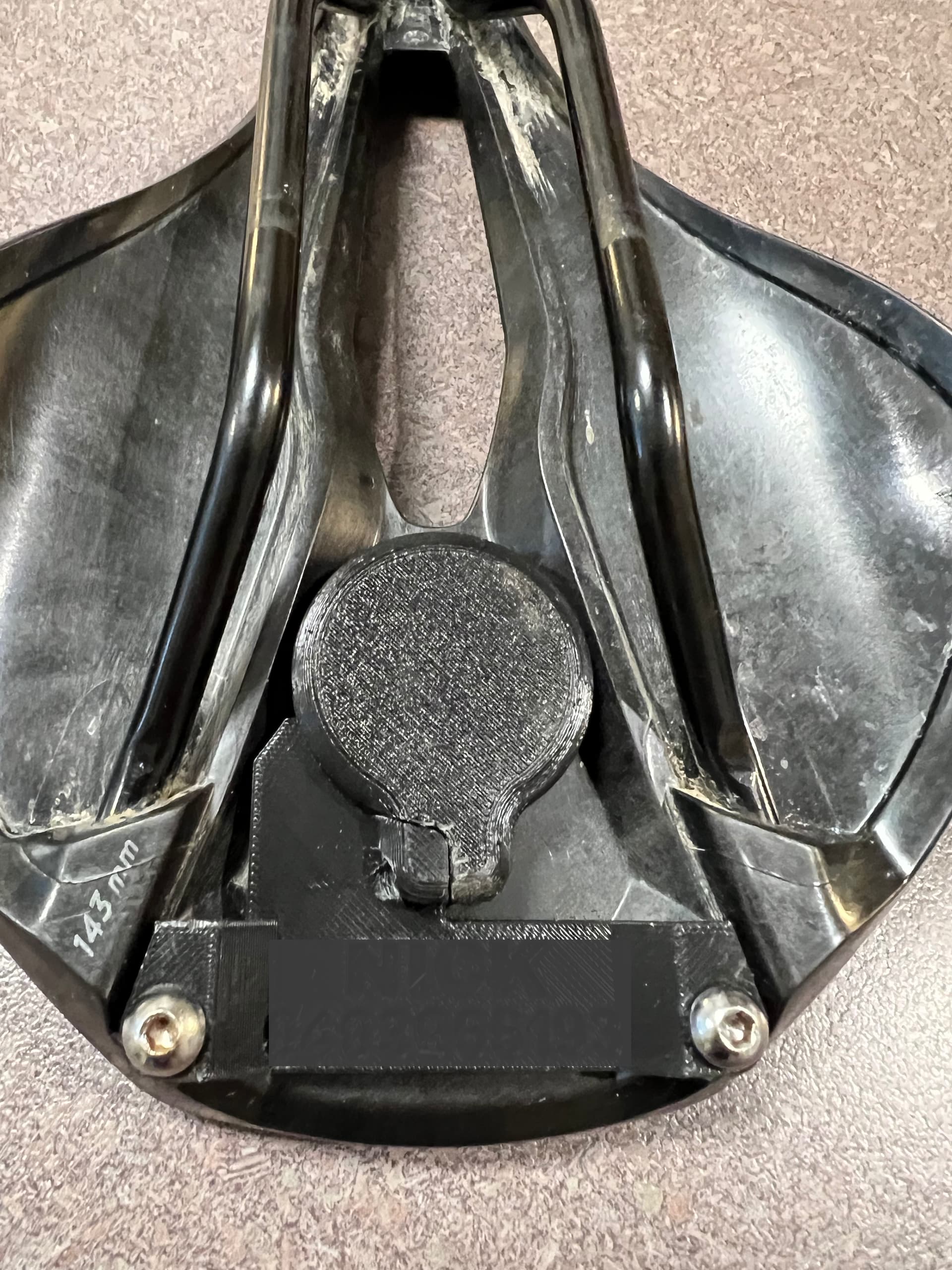 Stealth AirTag holder for Specialized saddles and a under-mount attachment for a Knog bell.