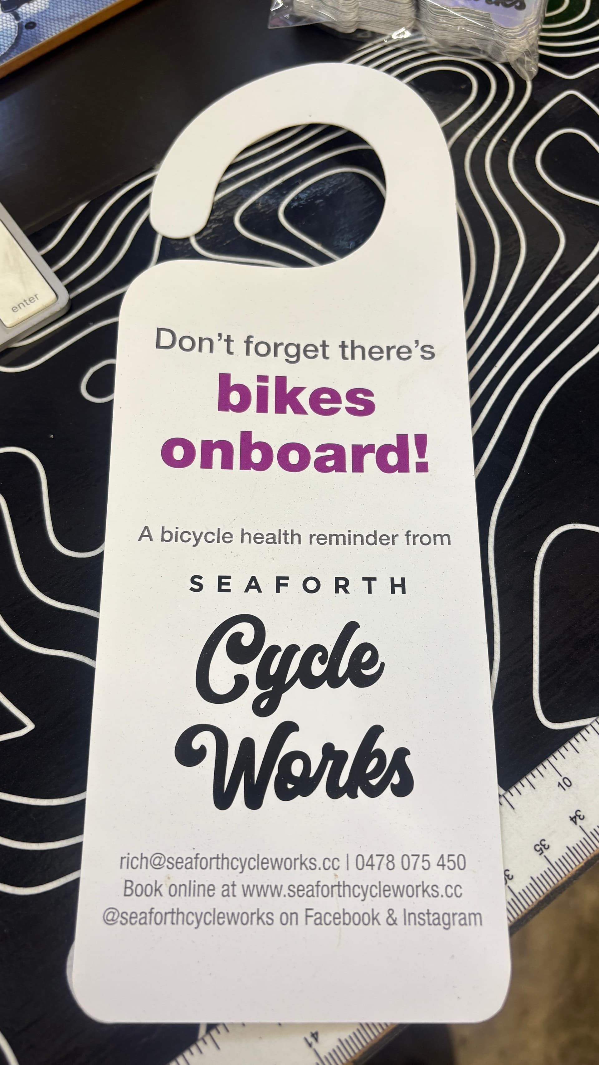 I produced these for hanging on the rearview mirror because one of my customers collected her bike after spending ~$400 with me getting her MTB serviced, then went shopping with it on the roof and trashed a carbon front wheel (she was lucky, it could have written off the whole bike):