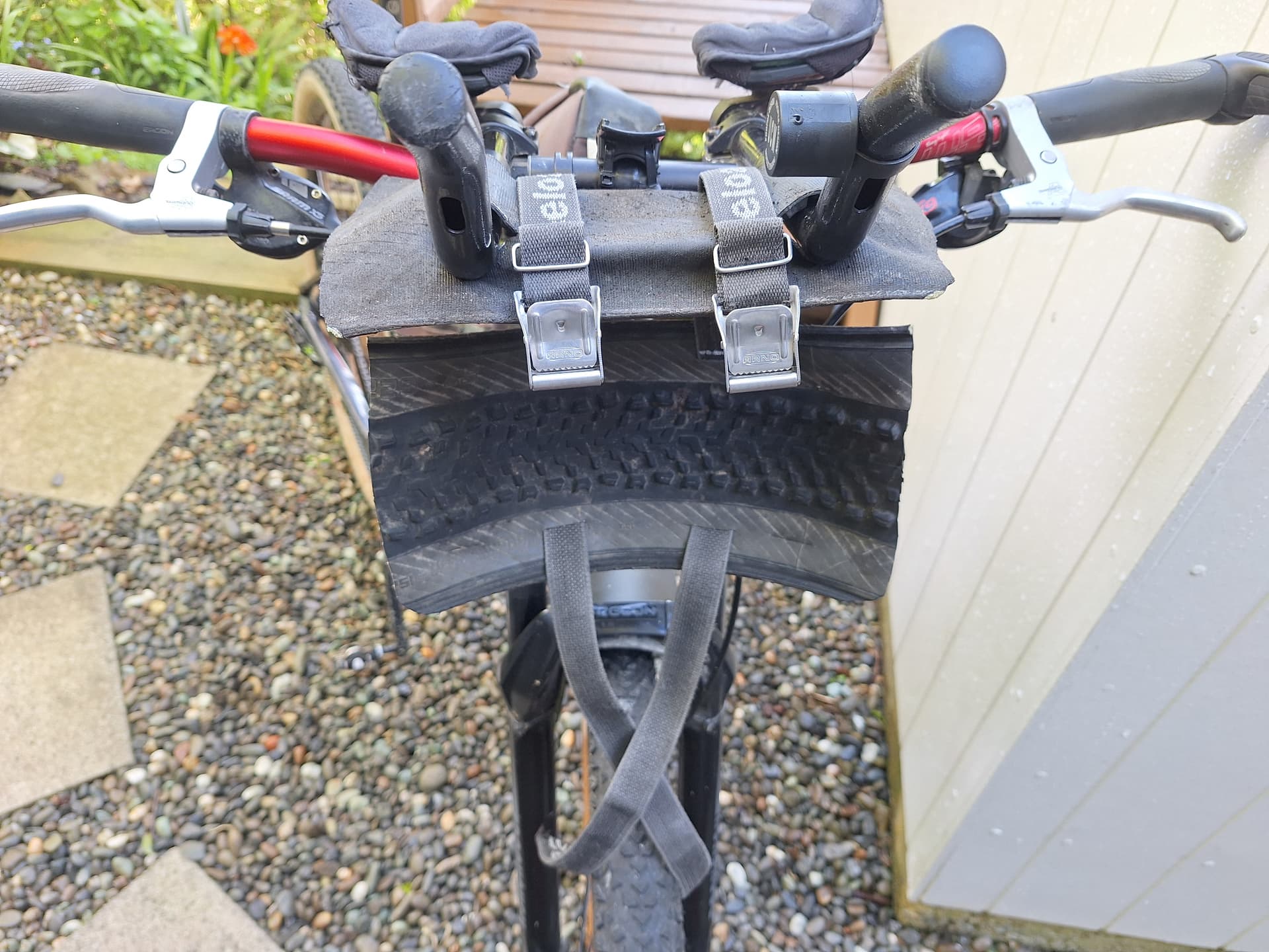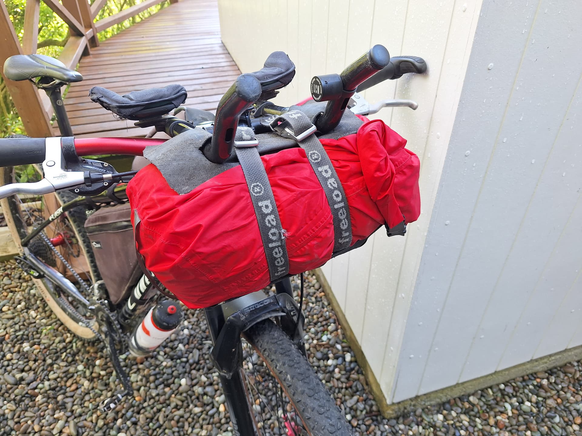I happy with the setup but I did experience the gradle sliding down a bit during the last trip. Tightening the clamp bolts a bit more helped. It’s also possible that the bolts loosened itself because I didn’t reapply fresh threadlocker. The packed weight of the dry bag and pouch as about 2.5 kg.