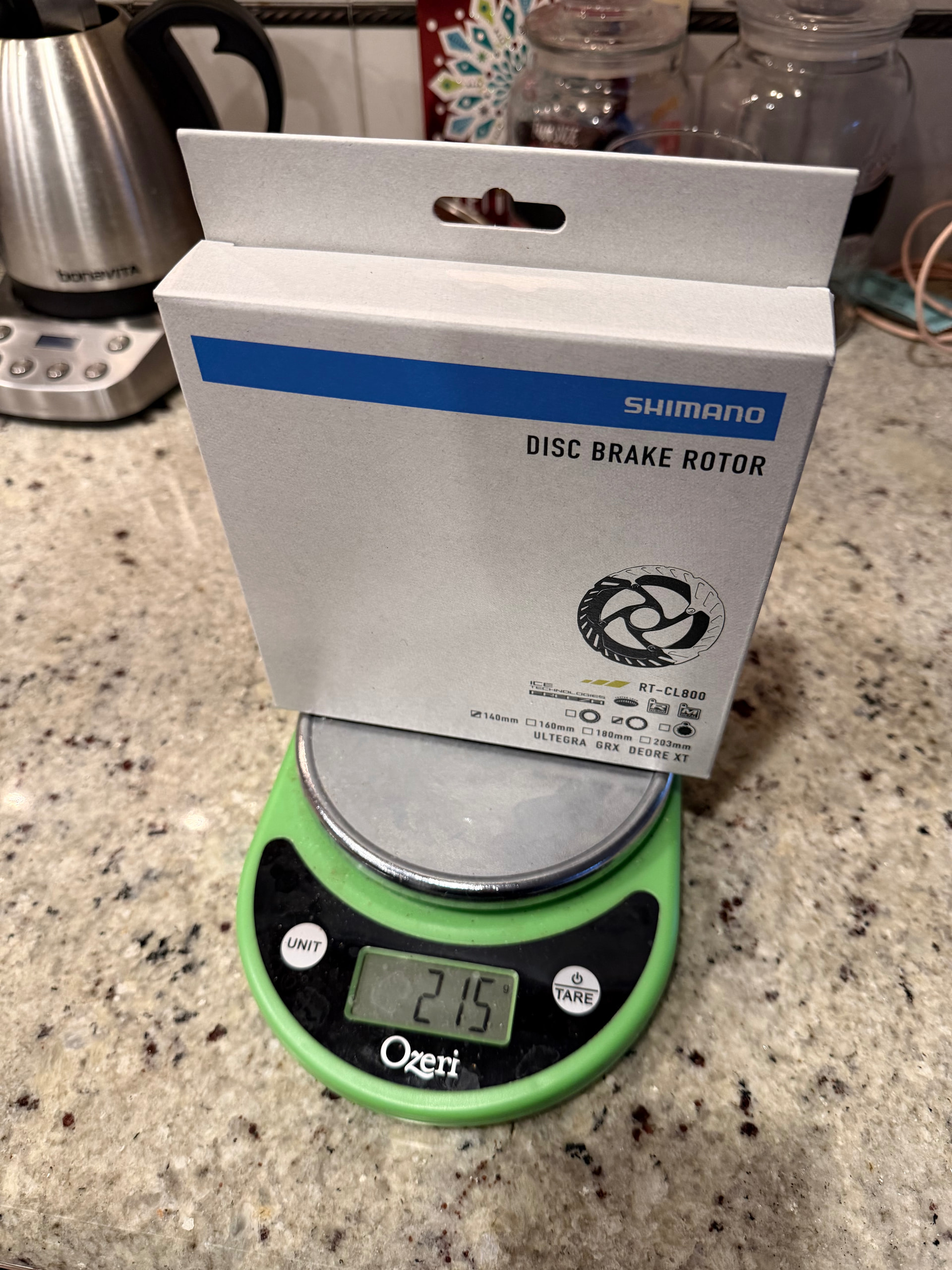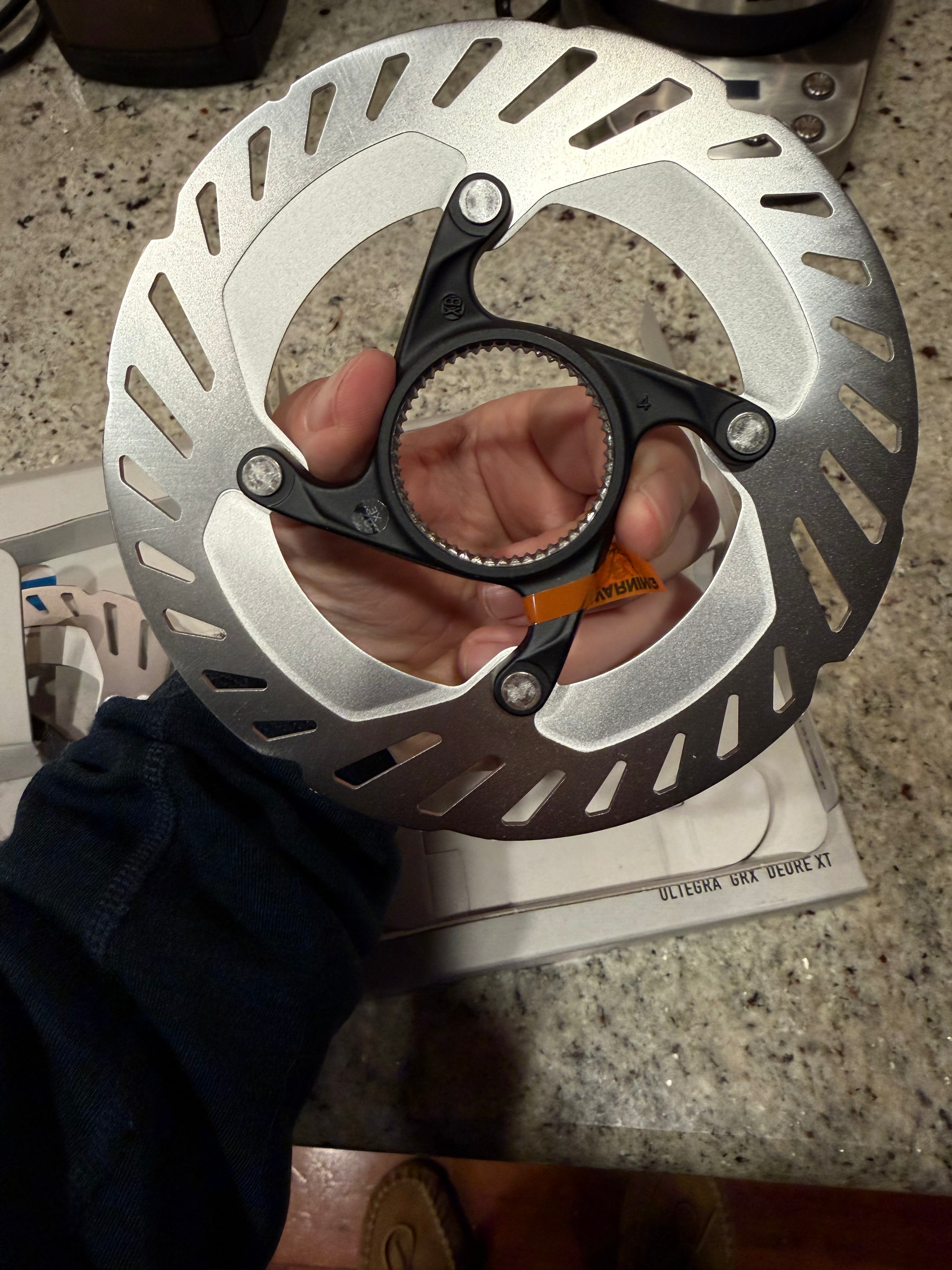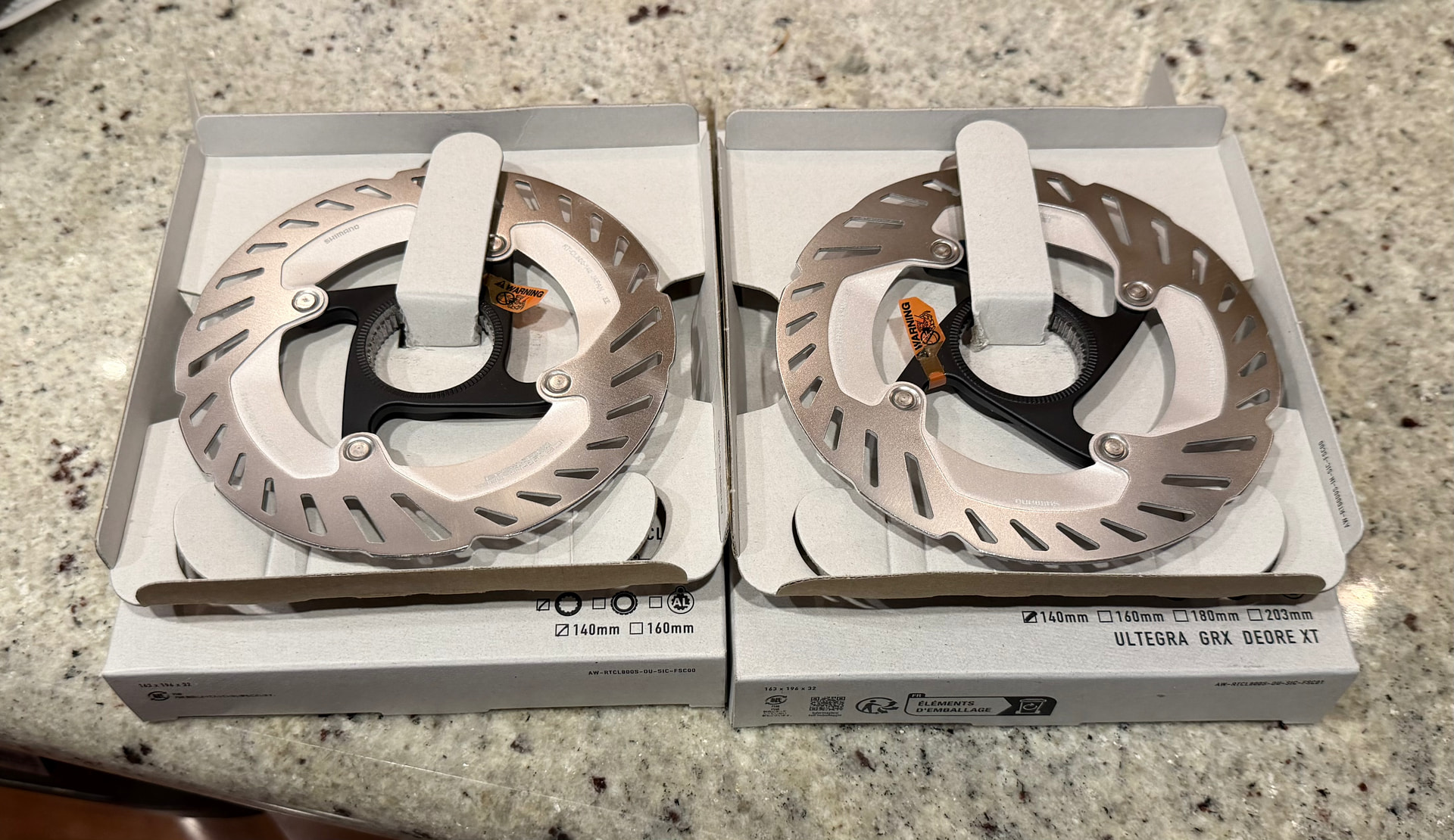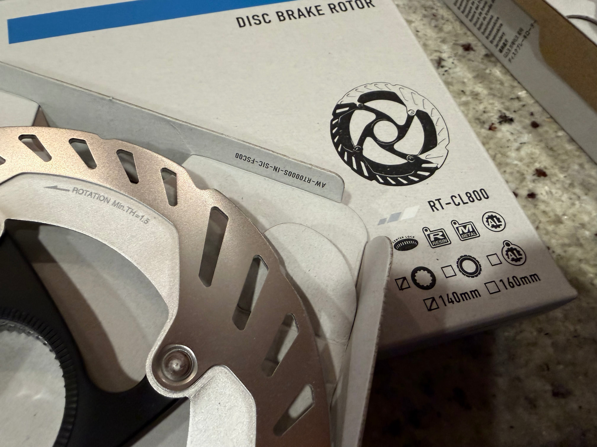 When they arrived, I noticed a packaging variation that left me wondering is one of these a fake? There was a spot of color on one package, and the same symbol was printed in a grayscale on the other. Lots of images below showing all sides of the box, the rotor, and the weight of the things.