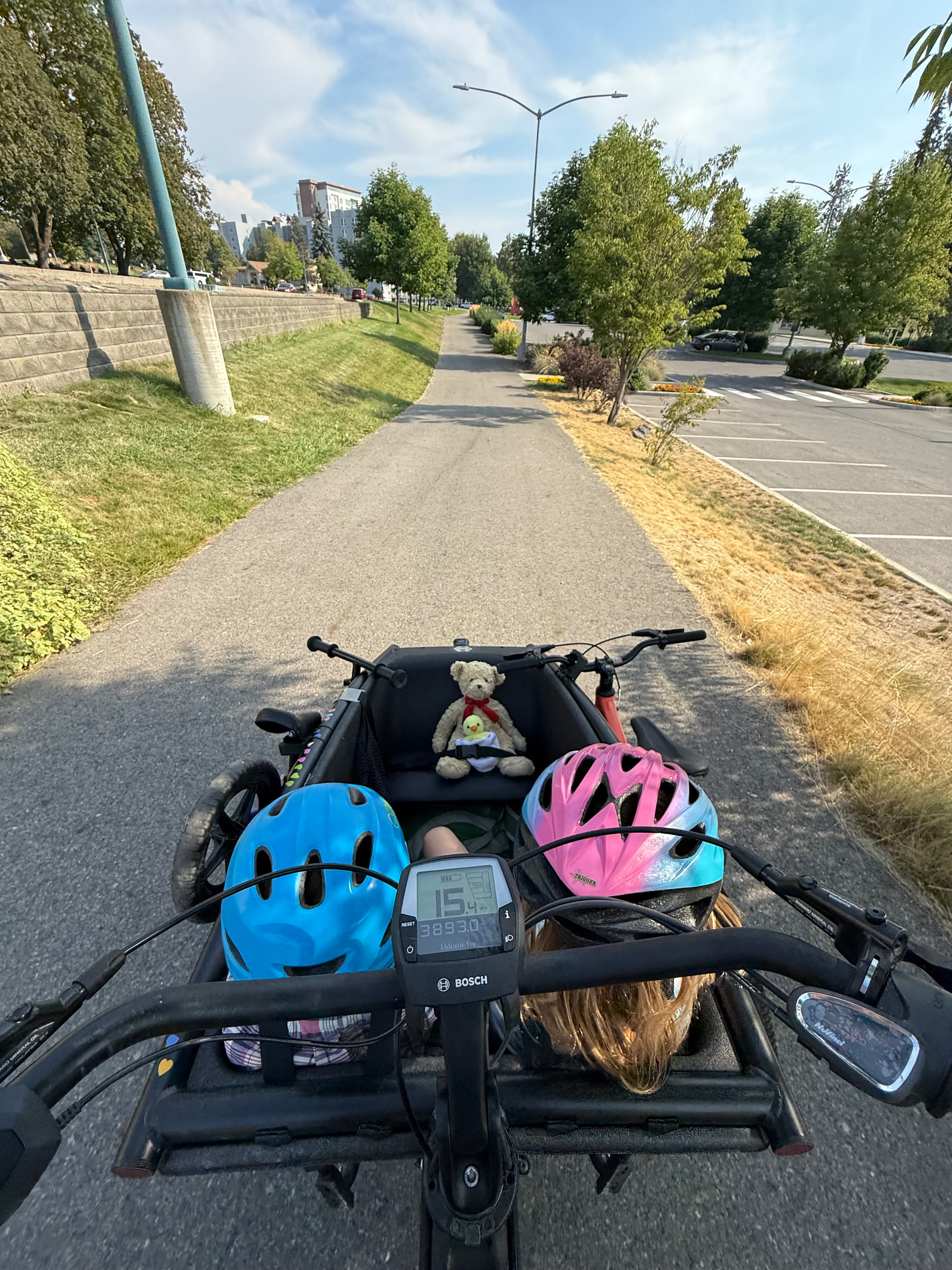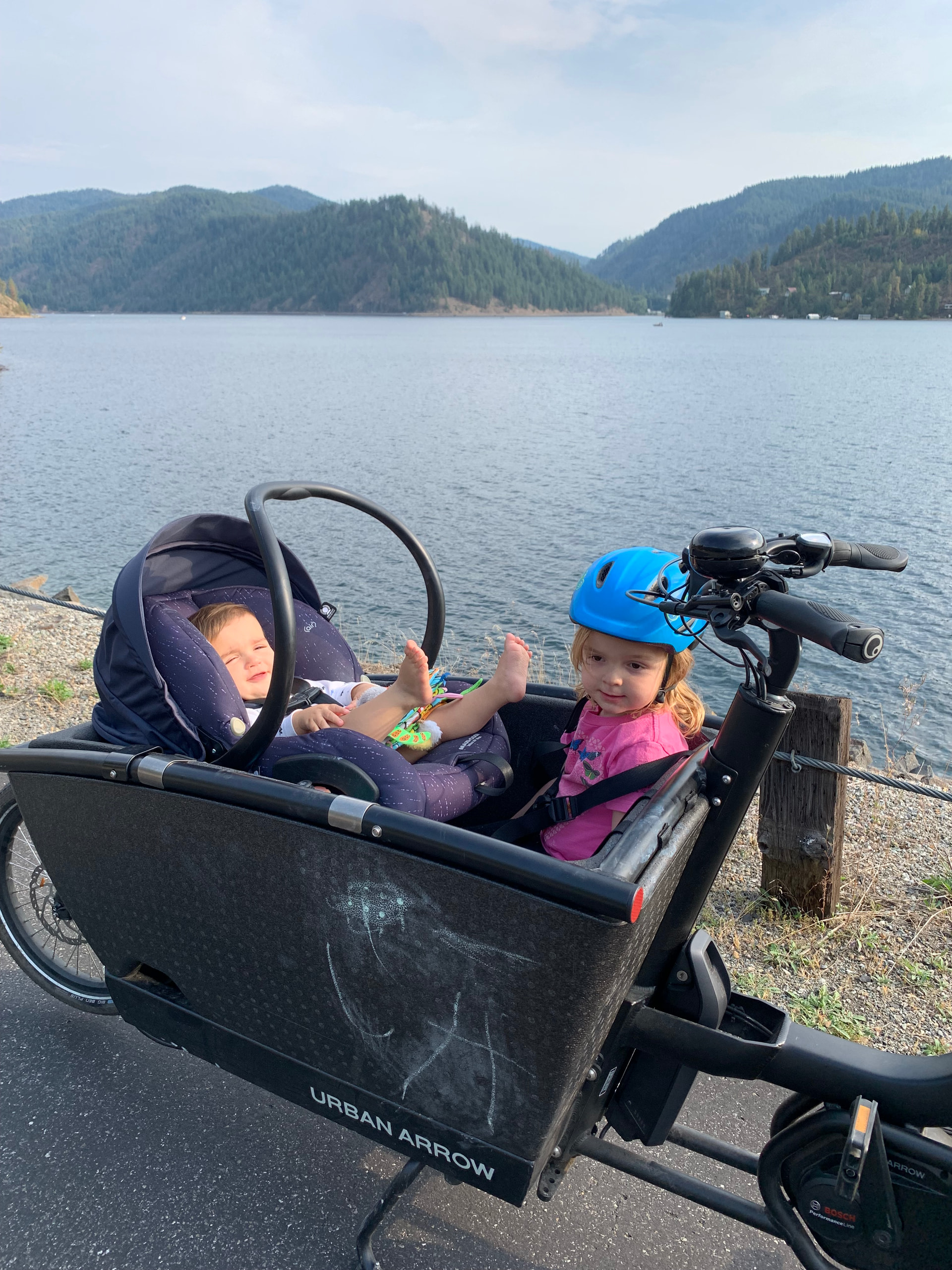 We have the Urban Arrow cargo bike, which is sweet, and I’m currently testing a Tern Quick Haul Long, which has been good now that both kids are a bit older. Chariots are fine but really suck your will to live uphill. The shotgun/macride is my son’s absolute favorite but hurts my knees after a while.