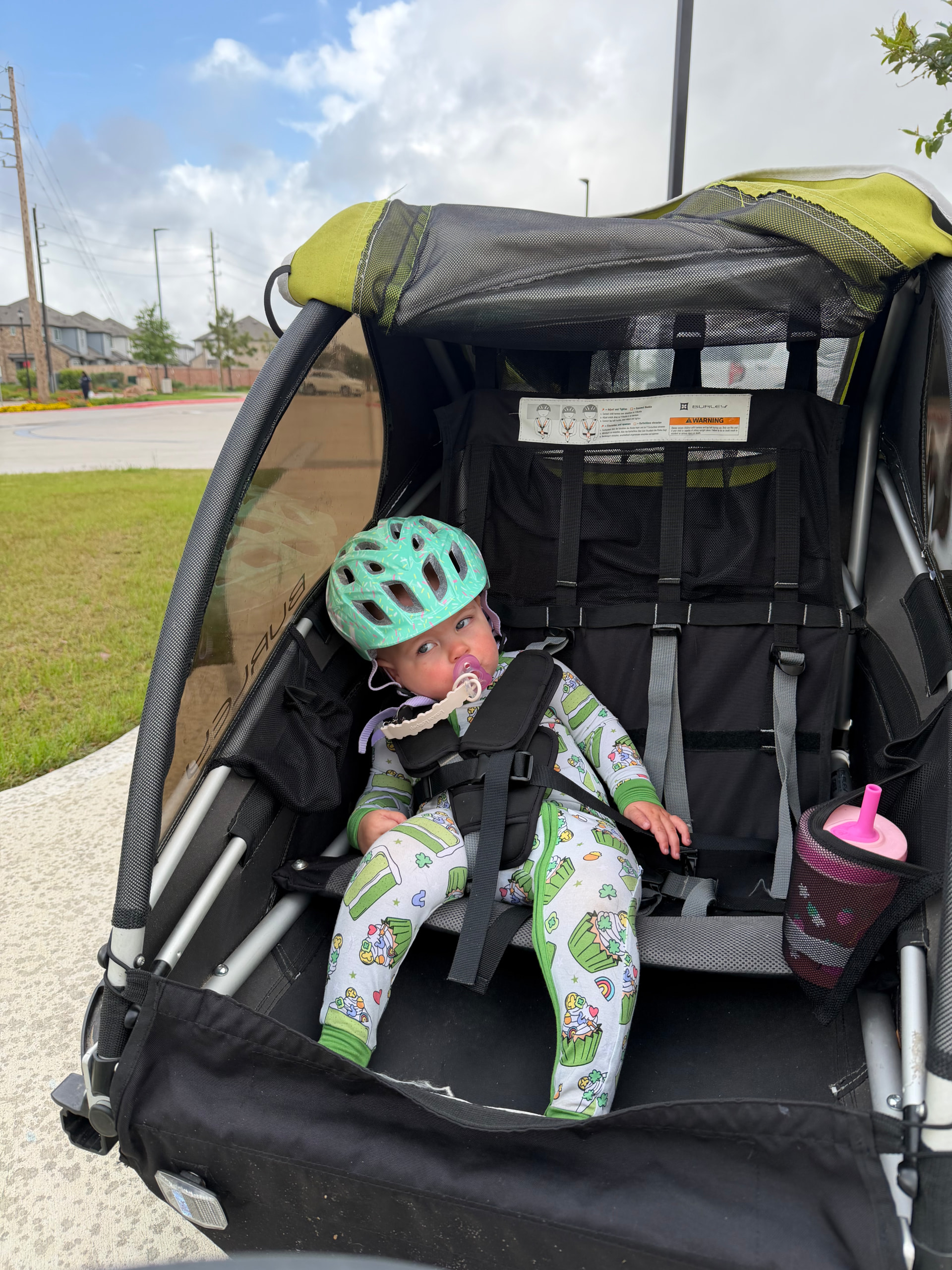 With the trailer, she can have her own space. We give her water, snacks, sunglasses, helmet, hat, and fan. She can’t drop anything along the way, and we pack extra snacks, clothes, diapers, underwear, wipes, and toys for whole days out in the storage section on the back. We can also use blankets to keep her warm in the early spring and late fall, and the trailer kept her dry when the skies opened up on us last summer. As others pointed out, it’s difficult to have a conversation, but we can hear when she needs something or is talking about something along the route. I use my road bike to pull the trailer.