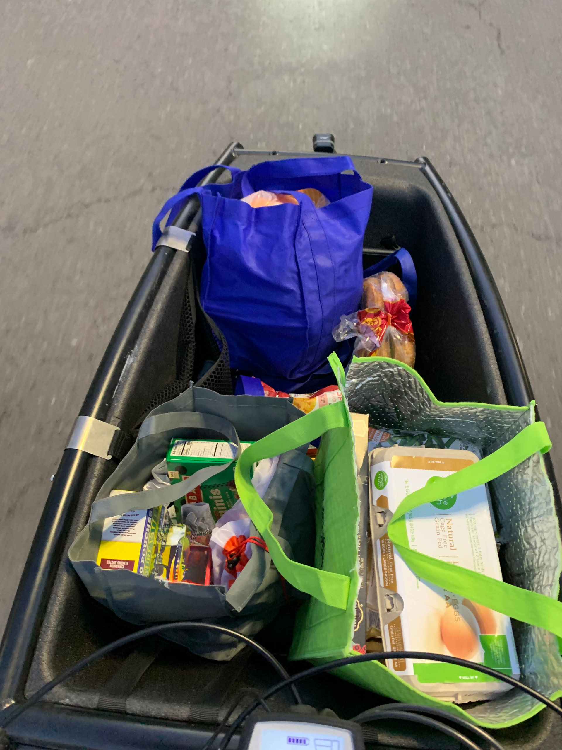 I have a rain cover which helps with rain and wind so I drop the kids off at school most of the year on my way to work (I still drive when it’s snowy or icy as one of my fears is going down with them in it). I can also fit about $300 of groceries in it when it’s just me.