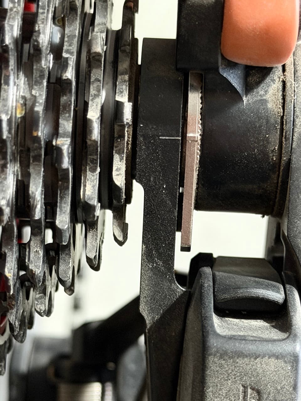 Bit of a gap between the left-hand side of the knurled ring and the right hand side of the derailleur.