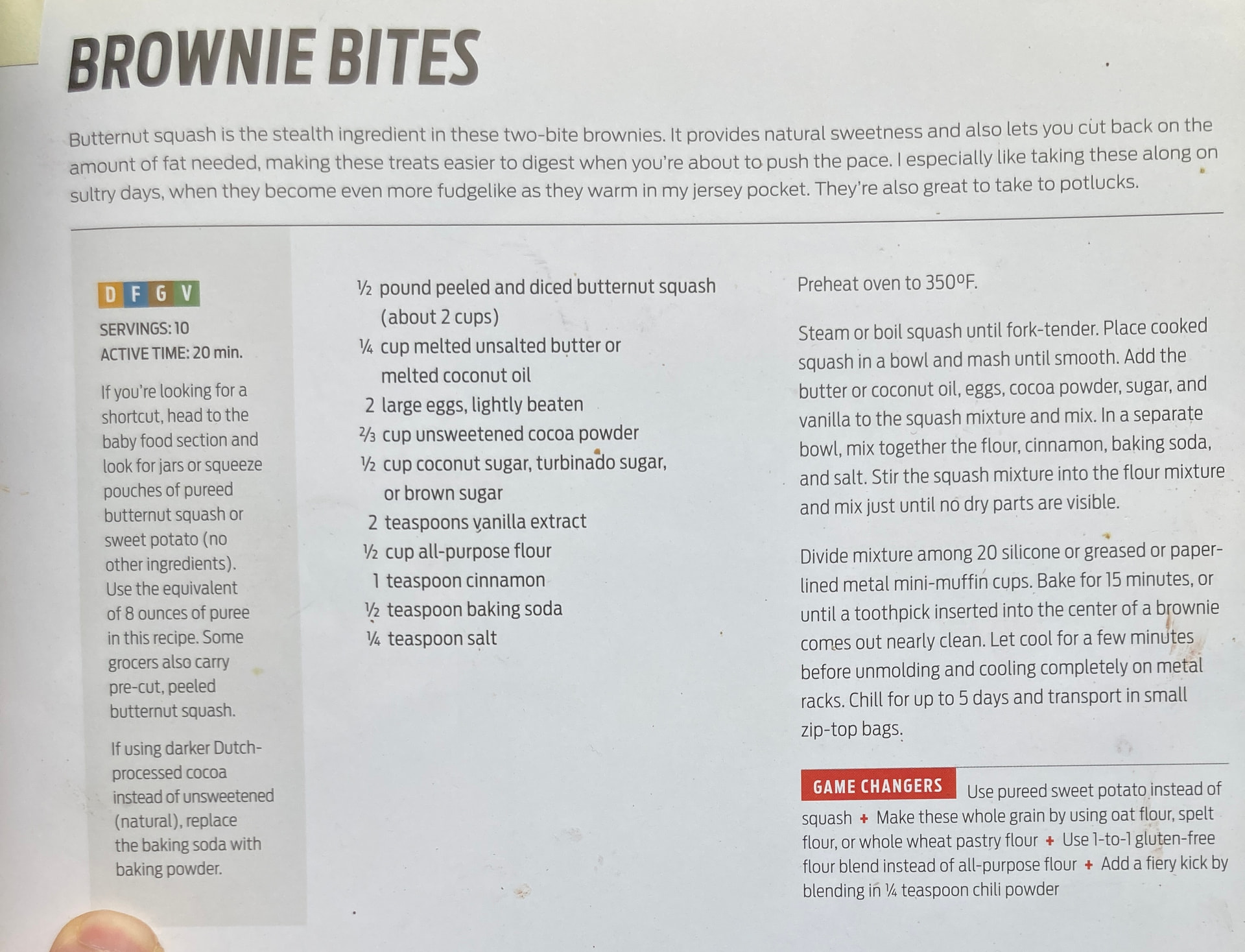 The brownie bites are from “Rocket Fuel” by Matthew Kady, which has a lot of good ideas for tasty homemade athletic fuel. I make them in mini-muffin pans with roasted sweet potato and oat flour and add nutmeg and diced candied ginger. Seriously tasty.