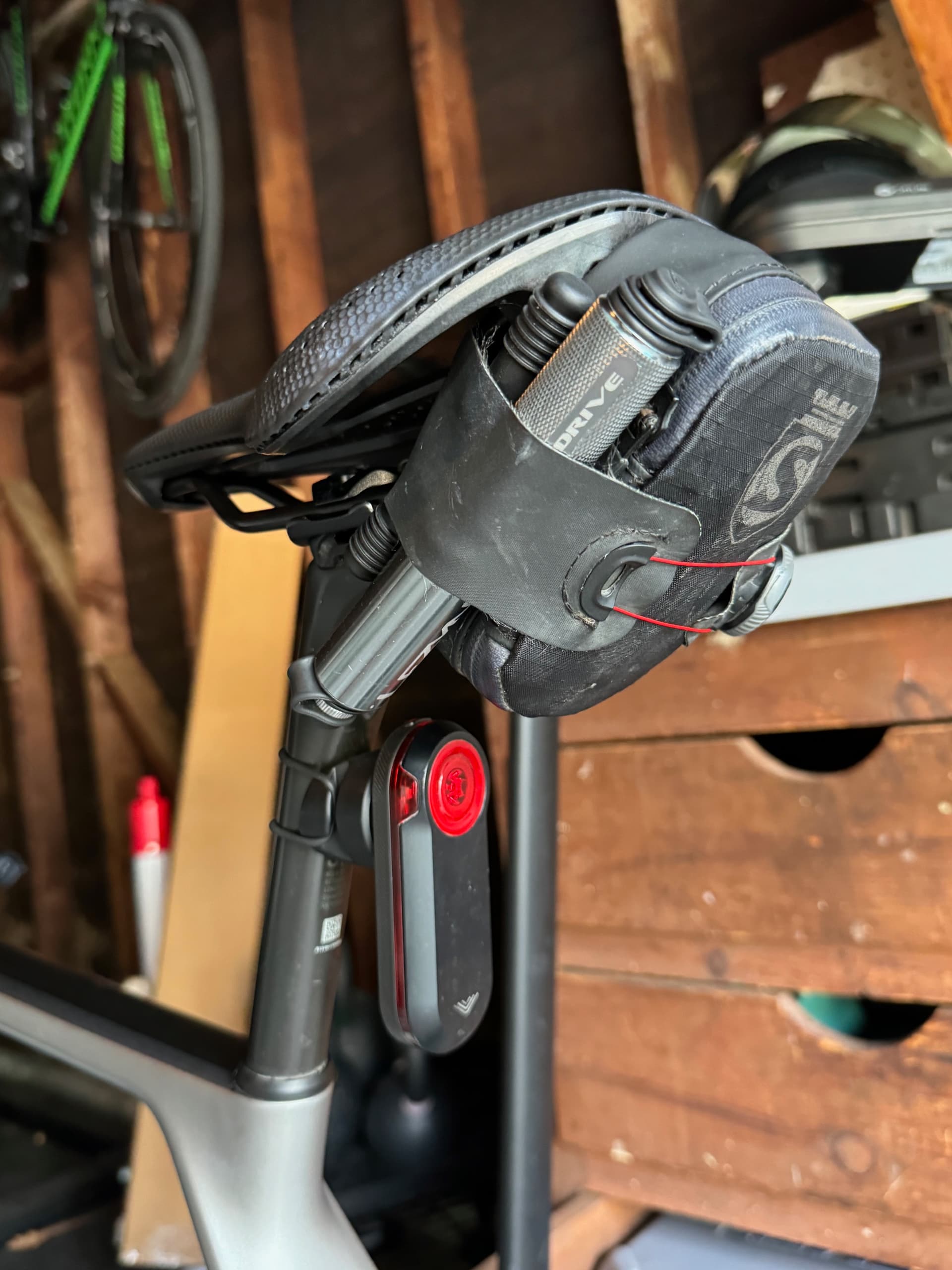 Now I have swapped to something mounted lower down on the bike (Daysaver essential 8, Dynaplugs, tube/lever) and am carrying a portion in my jersey with my phone (Dynaplug Air and electric mini pump). There is a noticeable difference in the weight reduction on the bike (542g → 147g) and I don’t notice the 198g in my pocket. Overall weight savings was 197g.