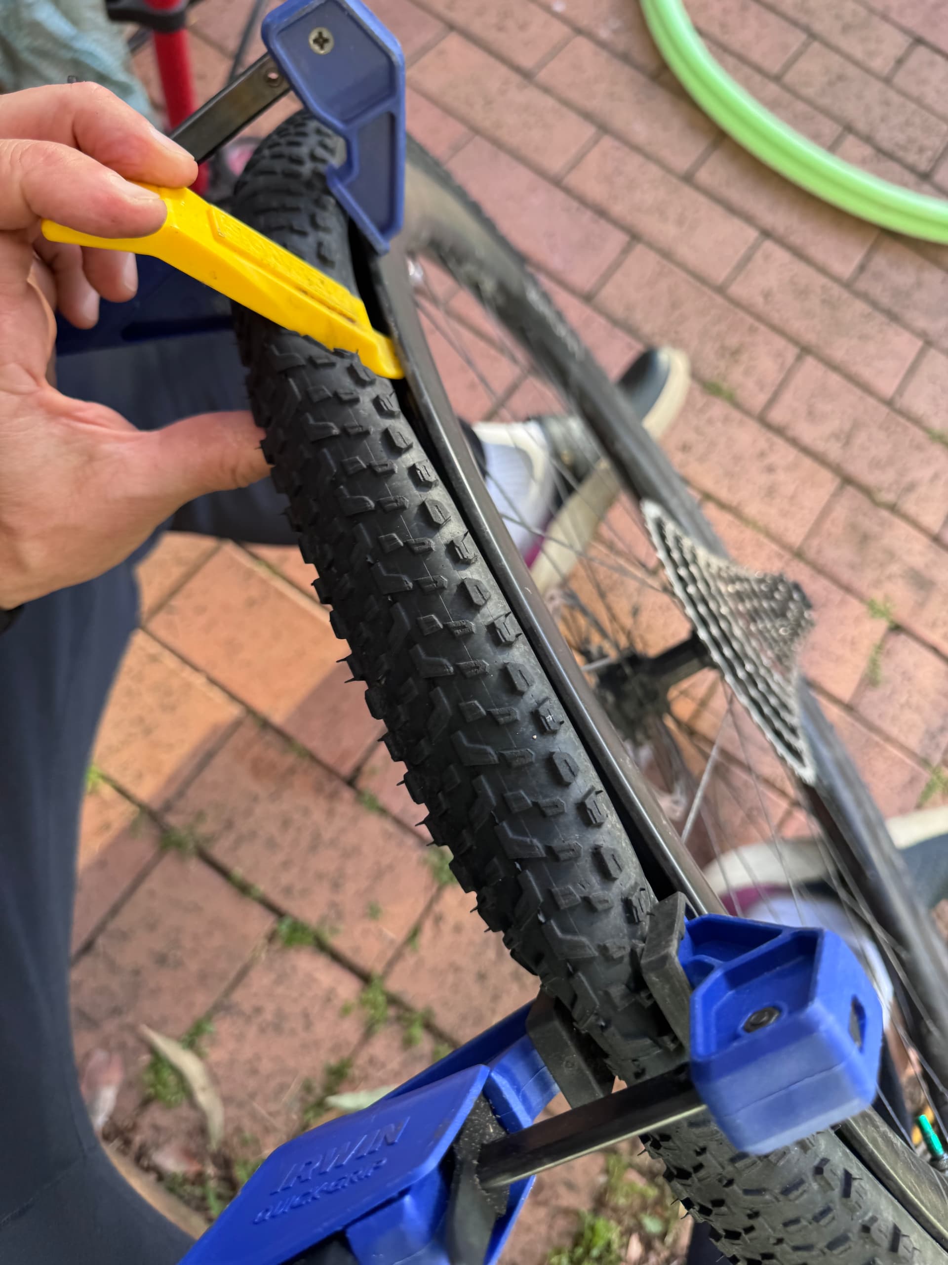 My biggest mistake at the start of this process was trying to hook the tire with the lever and remove it the same way I’d removed hundreds of tires in the past (i.e. hook it and lift it over the rim). But what I eventually realised is that breaking the bead by pushing it into the middle of the rim is the right technique. It still made a grown man cry a few times though!