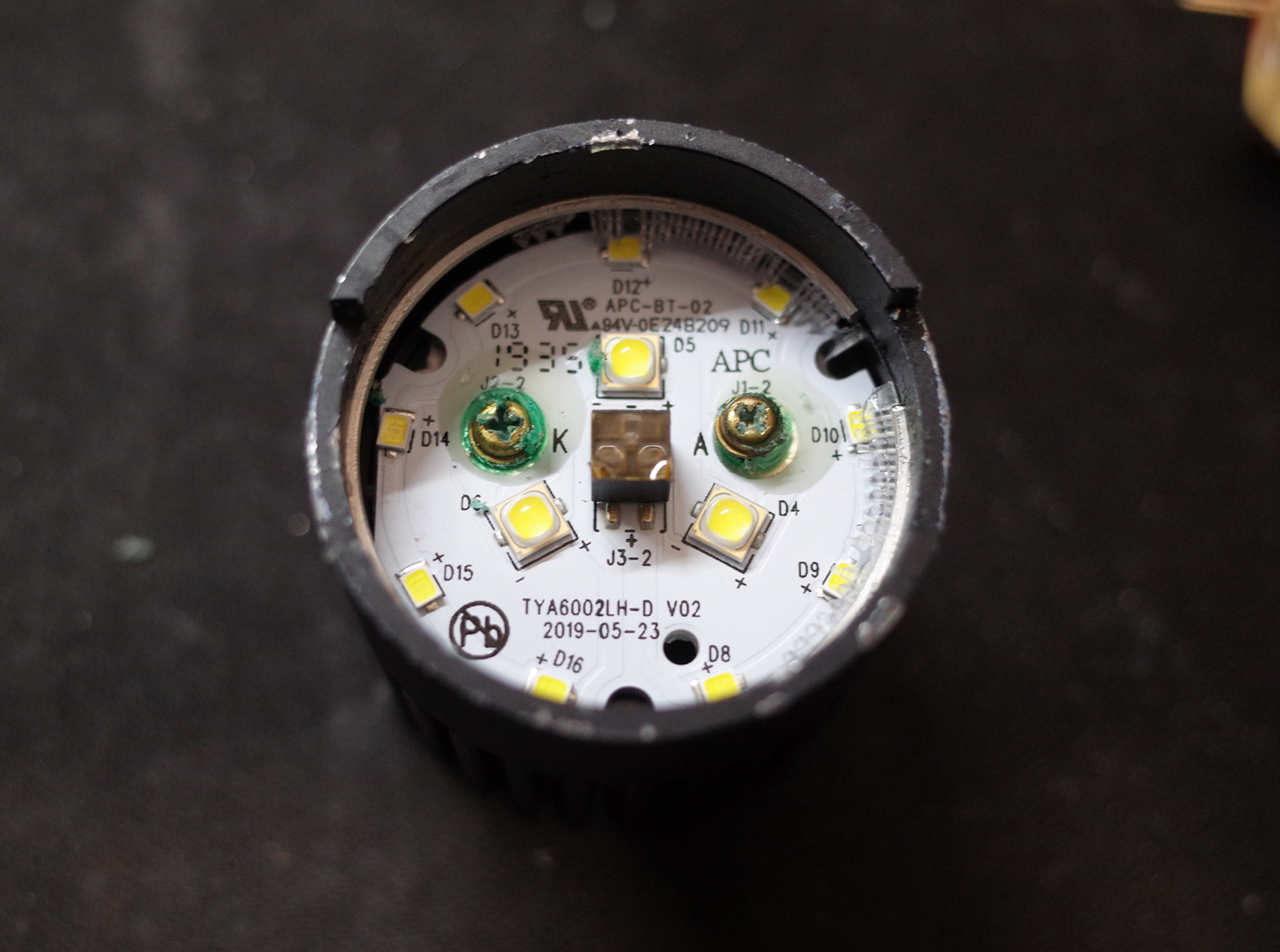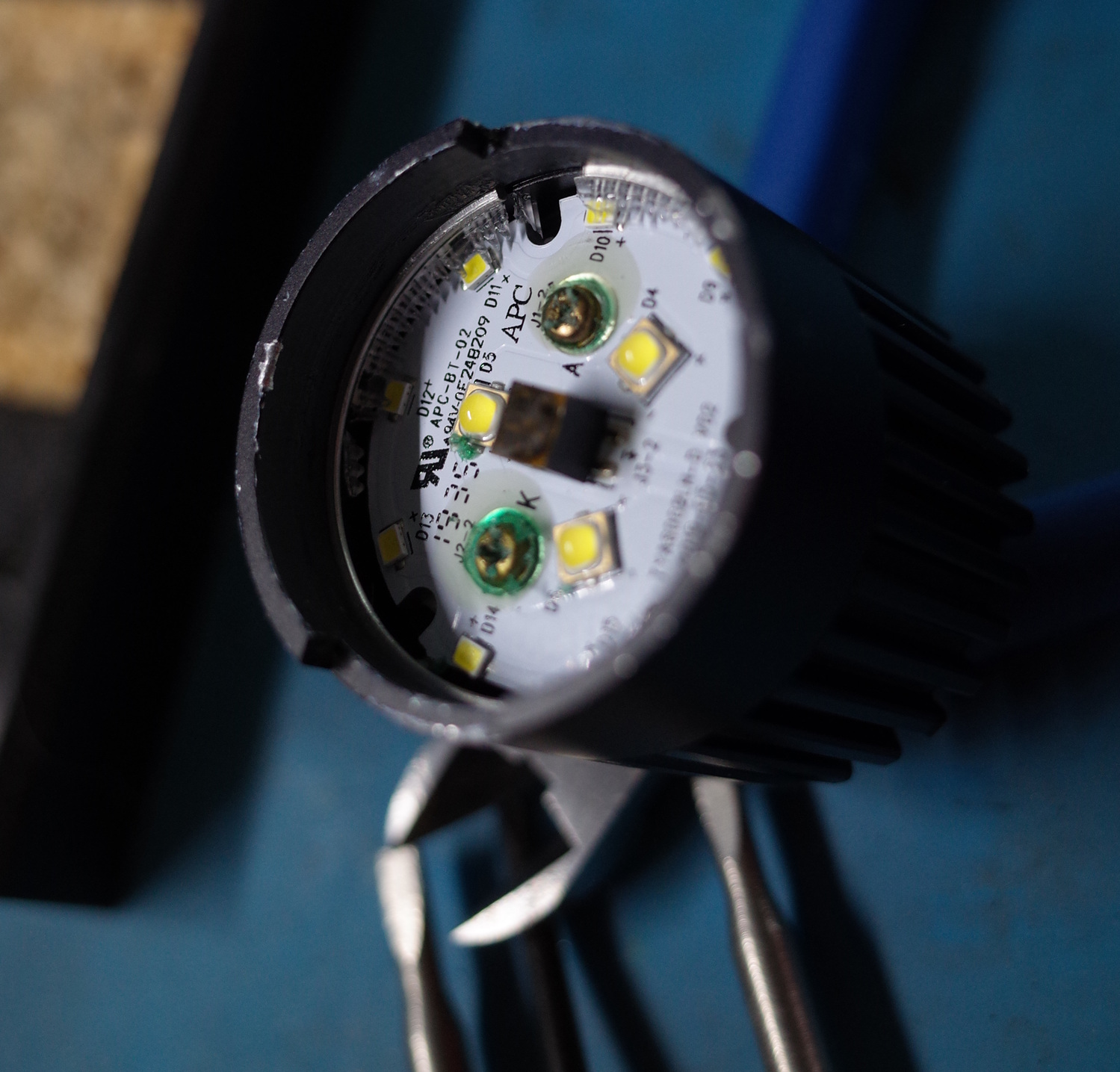 Two screws hold the electronics in place. These are why the lens has to come out. They seem to be the main power conductors for the LED board.