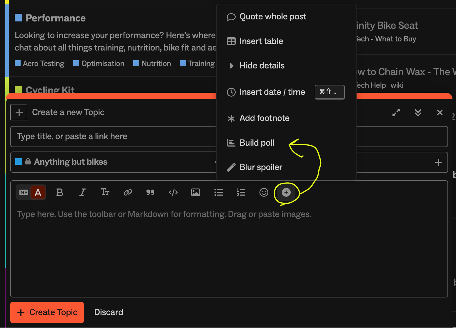 You have the option to create a poll if you’d like. Just click the “New Topic” button, then in the toolbar, click the “+” button and select “Build poll” in the in the drop down list that pops. You also add a poll in a topic that already exists. I think you’d get more responses, though, if the poll was in its own topic.