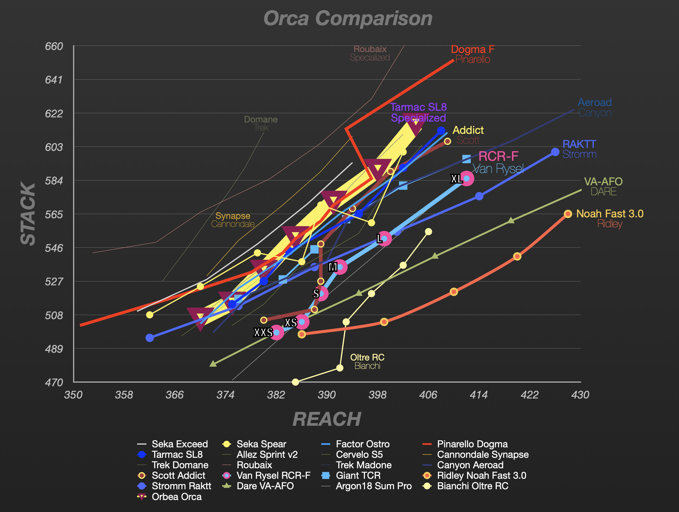 If your wife wanted something ‘racey looking’ she could also go with these other two that are ‘above the line’ from the Orbea Orca in her size, but she would give up ~1cm of raw stack which could be a deal breaker… Secondly these frames would ideally be built Frame-Up in order to have a platform for fine-tuning Front End. The advantage of frame-up is of course, you can choose your cranks, seat post offset, bar width, and order a couple stems for your project. And carry over your preferred saddle and finishing kits.