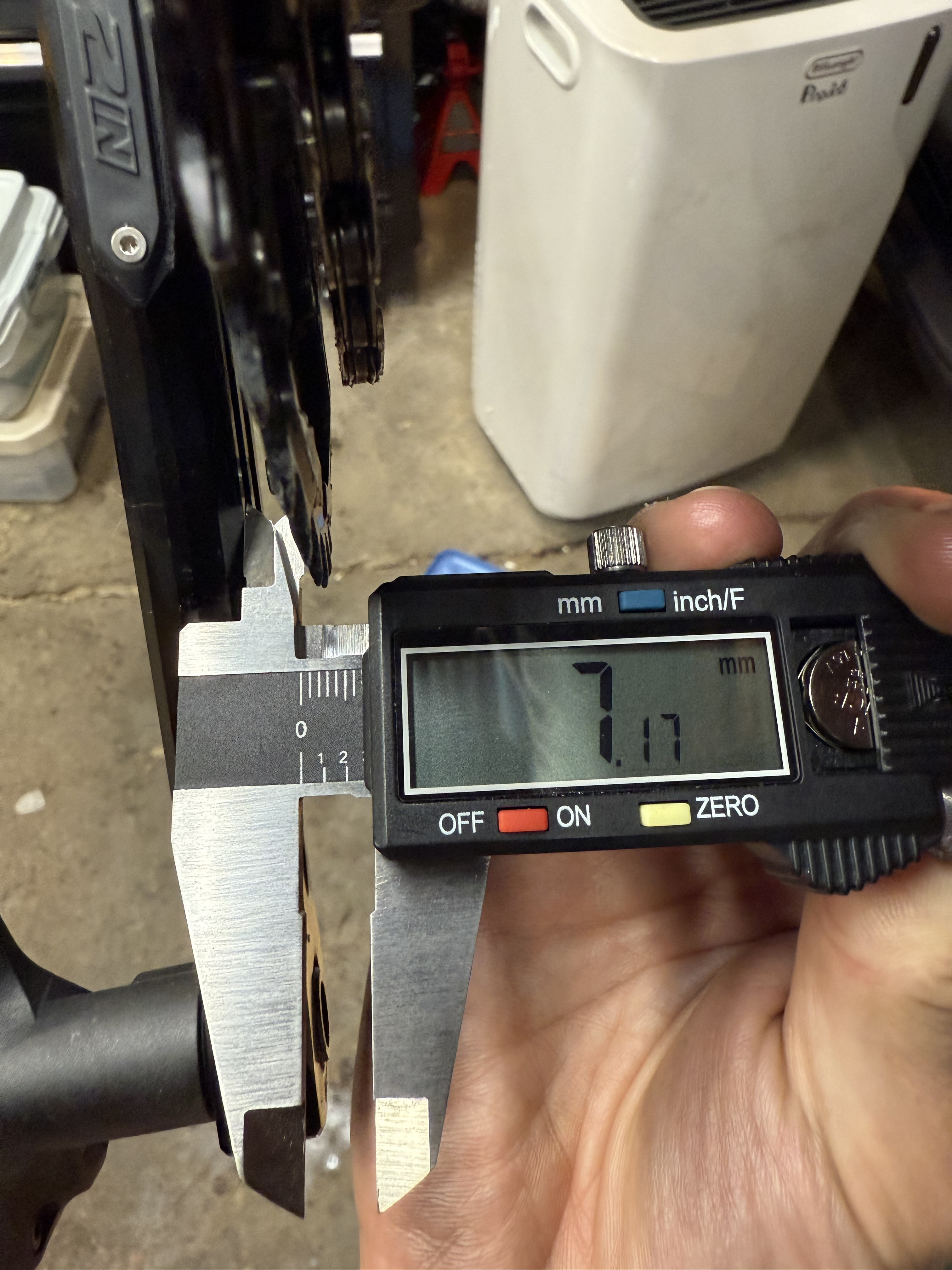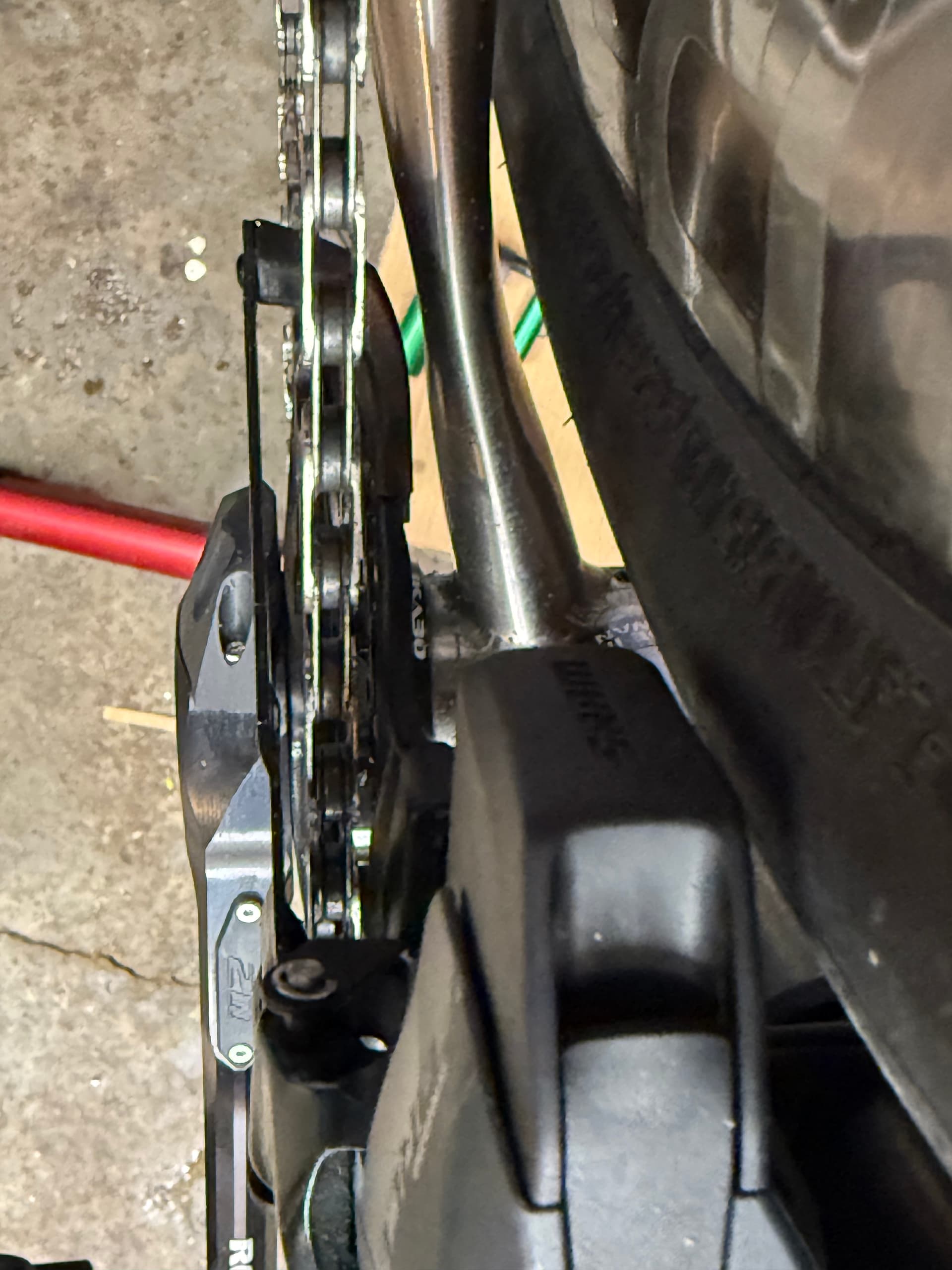 Bike #2: 54cm Supersix with a Power2Max 4 bolt power meter with a 30mm spindle. Again, didn’t want to mess with bottom brackets/crankarms so I tried the same Rotor chainrings with a (D2) front derailleur. Shifting isn’t quite as fast/crisp as with the sram chainrings but reliable and no drops. Recently I needed to replace the bottom bracket, so decided to go with dub and installed the same DFour power meter on the Supersix. Didn’t touch the FD as I figured both the Power2Max and Dfour spiders would give the same (Shimano) chainline. Now it shifts in the stand but is about 50-50 on missing front shifts on the road, which is better than I could ever get with the Ventum. I am going to try to set up the FD with the sram tool again.